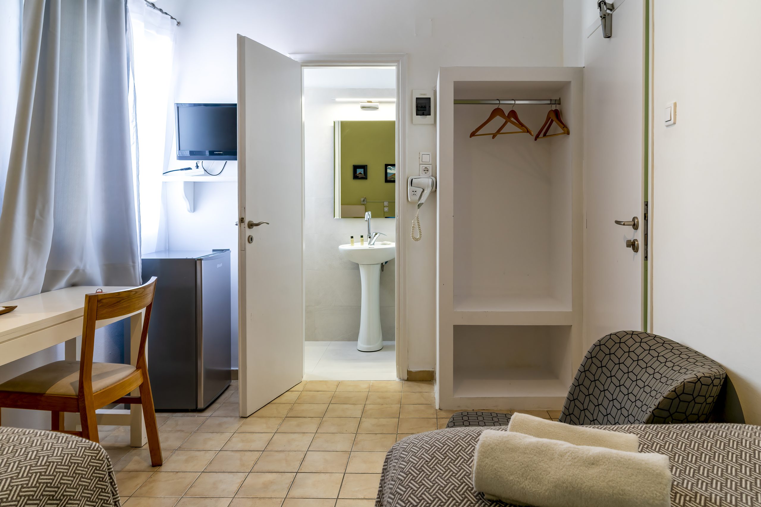 Our twin rooms are bright and airy, offering a relaxing retreat after a day exploring the island. They are conveniently located in the heart of Mykonos Town, just a short walk from the beach, shops, and vibrant nightlife.